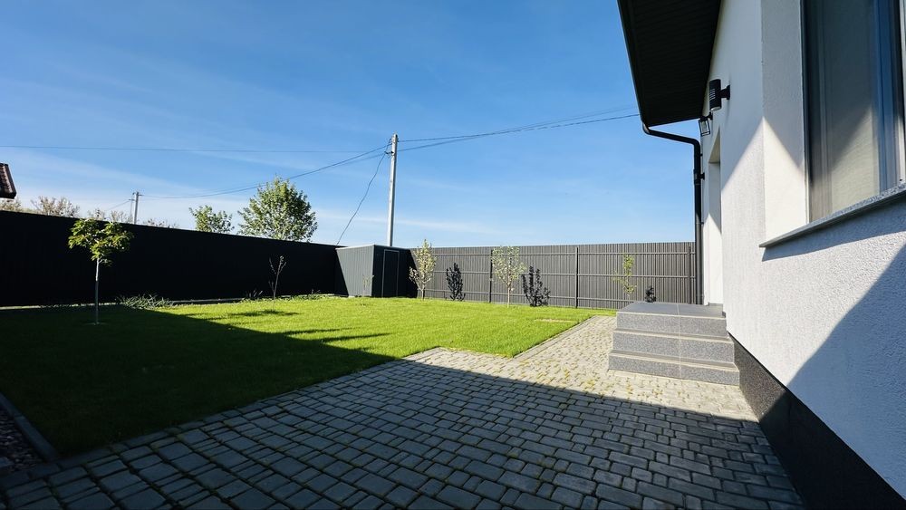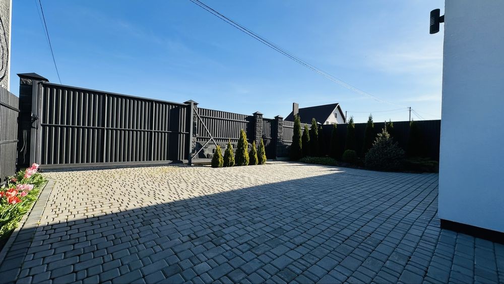Паркан, у дворі бруківка, газон, хвойні рослини, фруктові дерева. Також є контейнер для зберігання господарського інвентаря.