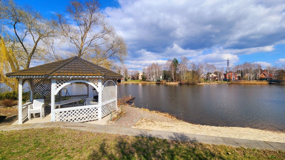На участке 42 сотки: дом для персонала, ландшафтный дизайн, зона барбекю, детская площадка, сад со взрослыми деревьями и туями, выход на свой пляж, причал, беседка для отдыха и рыбалки.