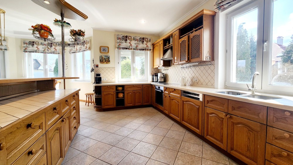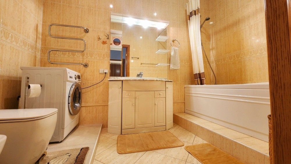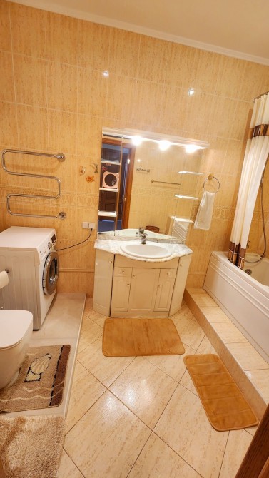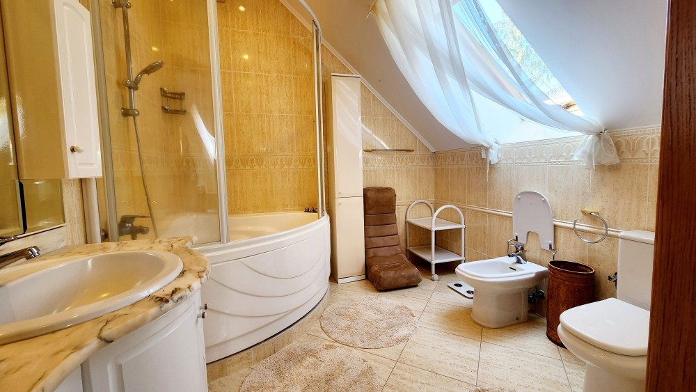 У будинку гараж з окремим входом, на 1-му поверсі передпокій з гостьовим санвузлом, гардеробом, пральня, кухня, їдальня, вітальня з каміном та виходом на терасу, підлога з підігрівом, посудомийна машина, окремий СПА-блок з басейном, сауною та виходом на терасу.