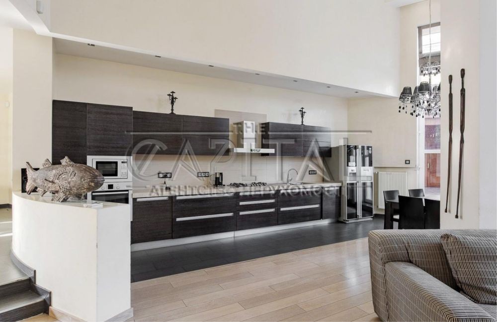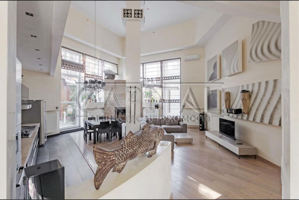 Простора зала з високими стелями, кухня їдальня