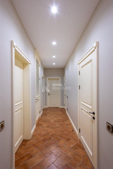 Перший поверх вражає просторою кухнею, їдальнею та гостьовою з каміном, а також має пральню, технічну кімнату, критий басейн. Другий поверх включає чотири спальні