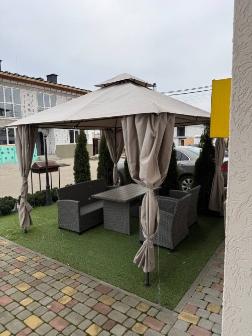 На вулиці мангал, бесідка та садові меблі