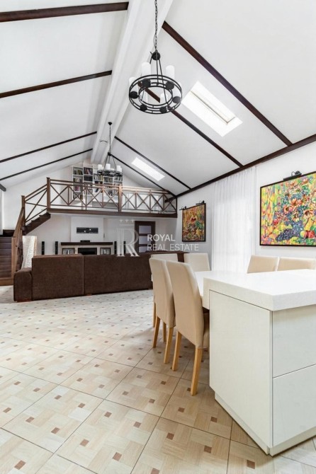 Просторий основний будинок з трьома спальнями, ізольованими санвузлами і гардеробними в двох з них. Вітальня площею 70 м² з каміном та другий світ із міні-бібліотекою — ідеальні для відпочинку. Панорамна тераса з зимовим садом, мангалом і кухнею — ваш маленький оазис.