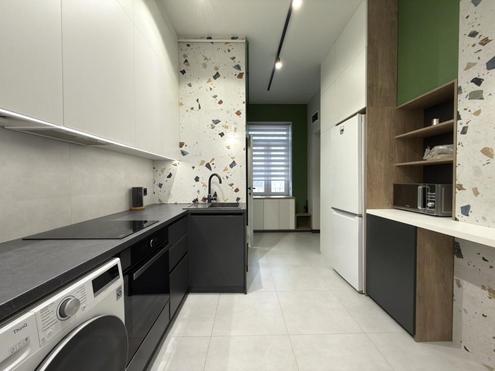 Побутова техніка: кондиціонер, пральна машина-сушарка (2 в 1), мікрохвильовка, Smart -TV, індукційна плита, духова шафа, кавоварка, електрочайник, праска, порохотяг