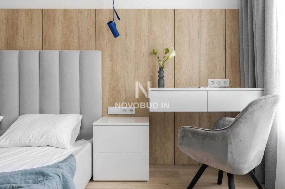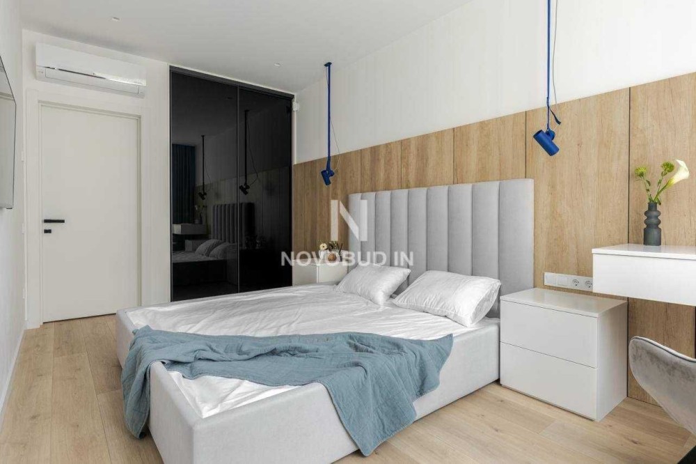 Ізольована спальня: двоспальне ліжко з матрацом, робочий стіл, гардеробна.