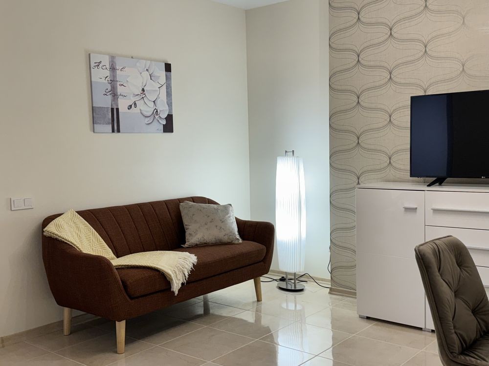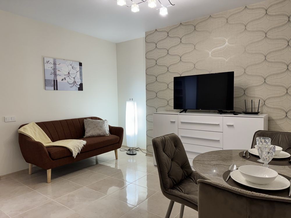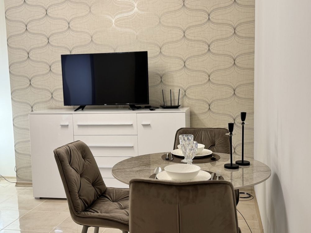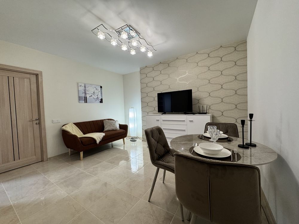 -вітальня з телевізором та новим диваном, столом та стільцями
