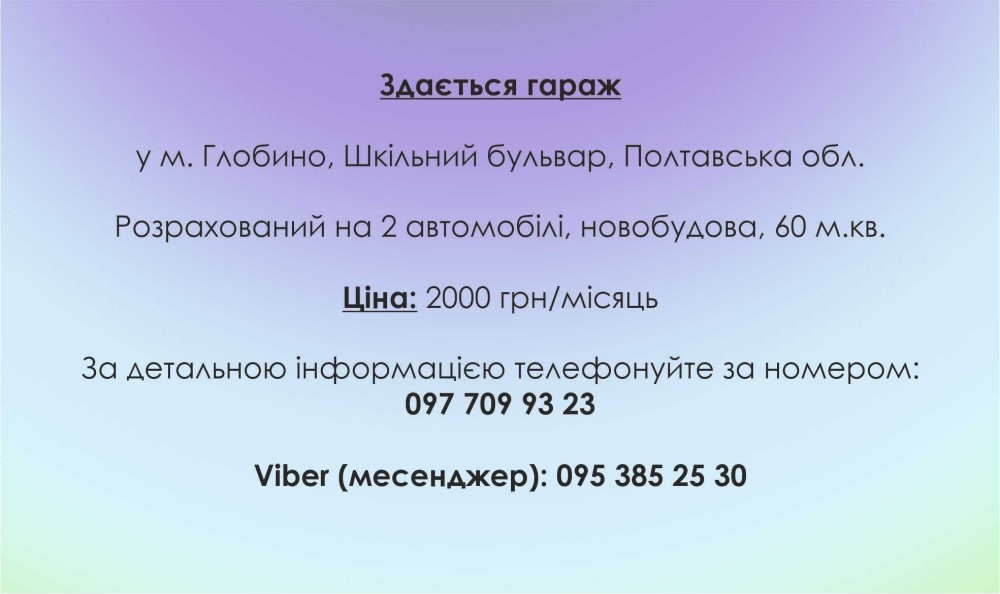 Оренда гаражу на 2 автомобілі м. Глобине