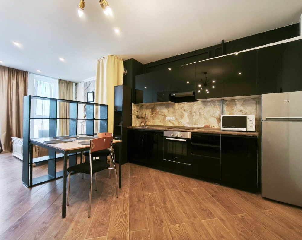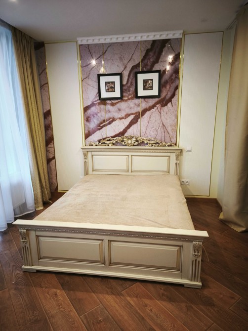 Із меблів є двоспальне ліжко із натурального дерева, розкладний диван і велика шафа, вбудована кухня з італійськими фасадами.