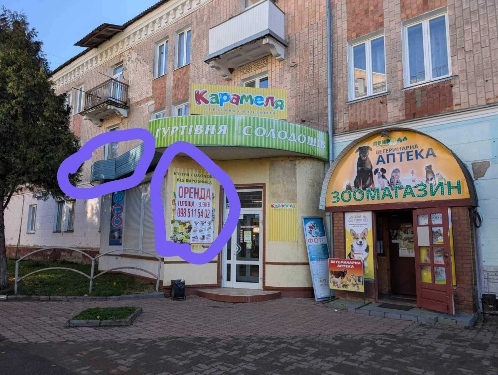 Приміщення знаходиться в самому центрі міста на площі - з великим трафіком людей. Поруч аптеки, магазини, супермаркети.