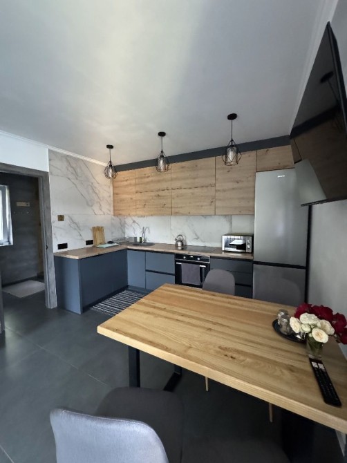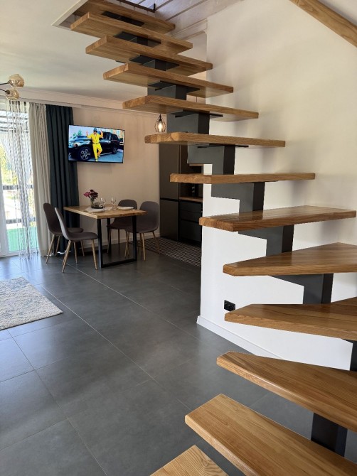 Кухня-студія з каміном та виходом на терасу, санвузол та 2 кімнати на другому поверсі.