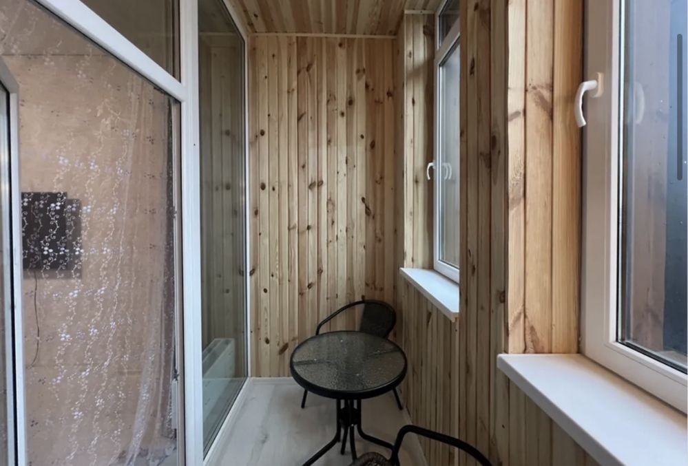 - Лоджія-4кв.м. засклена, утеплена як окремий кабінет або зона відпочинку зі столиком та кріслами.