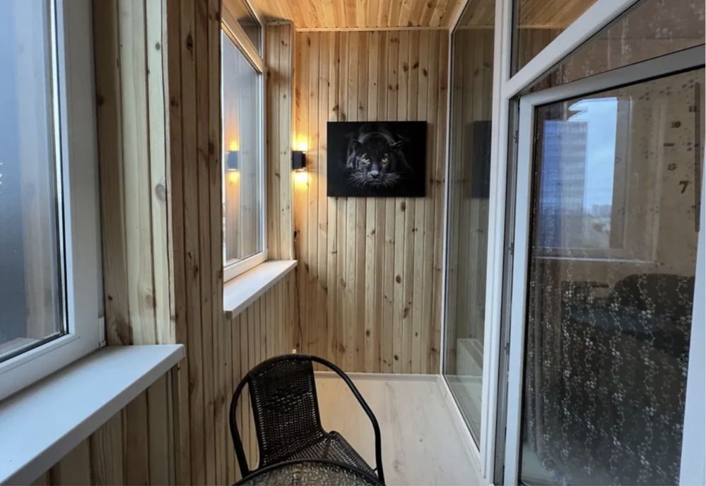 - Лоджія-4кв.м. засклена, утеплена як окремий кабінет або зона відпочинку зі столиком та кріслами.