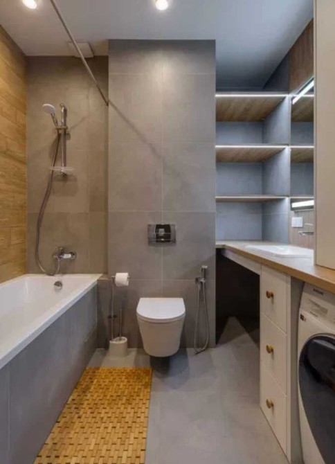 Передбачено підігрів підлоги, прально-сушильну машину, багато місць для зберігання речей.