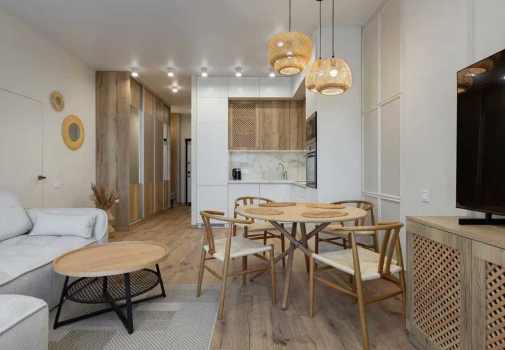 Вітальня, об’єднана з кухнею, 1 спальня, 1 санвузол та гардеробна.