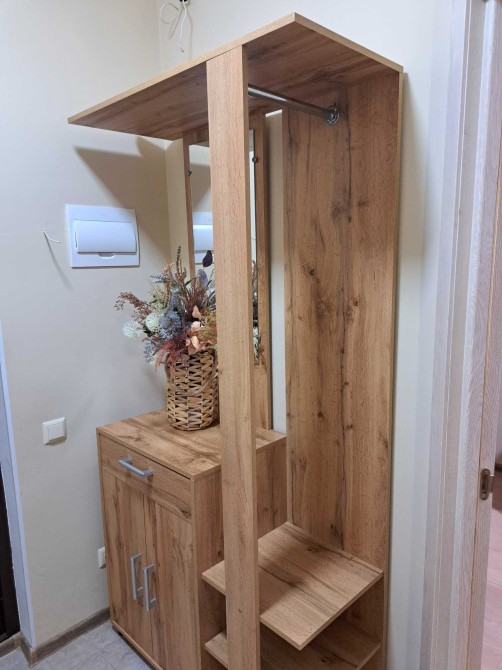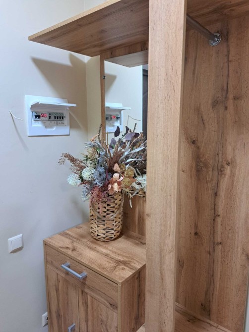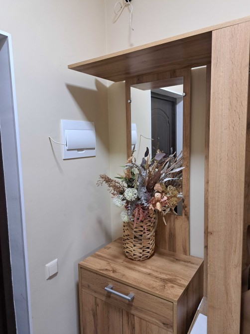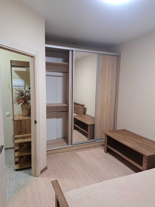 Мебльована: двоспальне ліжко, тумбочка біля ліжка, велика шафа-купе, вбудована кухня, розкладний диван, обідня зона, гардеробна для верхнього одягу в передпокої