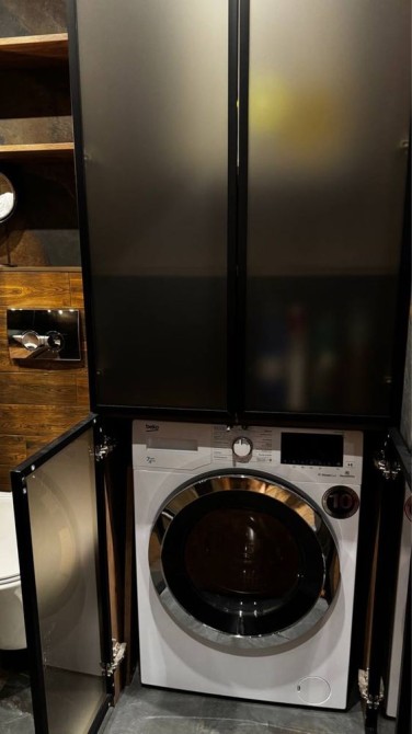 Простора ванна кімната з пральною машиною, прихованими шафами для зберігання і душовою з чорним фурнітурним декором.