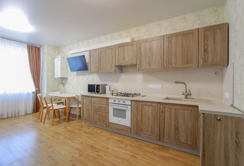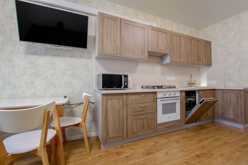 холодильник, газова плита, духовка, посудомийна і пральна машинки, мікрохвильова піч, електрочайник, один телевізор, газовий котел (гаряча вода і опалення)