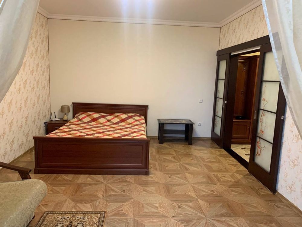 Исторический центр Киева, бул. Л. Украинки 9. Пешком до Крещатика 20 минут, столько же и до Печерской Лавры. Метро Печерская 350м. Хорошая 4-комнатная квартира после косметического ремонта. Чистота и уют. 3 отдельные спальни с 2-спальными кроватями, гостиная с угловым раскладным диваном, дополнительно есть раскладная односпальная кровать. Новые постельные принадлежности, укомплектованная кухня, скоростной интернет и SMART TV 4K 50', кондиционеры во всех комнатах, электробойлер и центральная теплосеть, балкон застеклён, есть городской телефон. Зелёный двор с бюветом, спортивной и детской площадками, со шлагбаумом и парковкой. В доме салон красоты и аптека, рядом кафе и рестораны, супермаркеты, банки, остановки транспорта. Цена до конца войны договорная и зависит от количества дней аренды и числа заселившихся, возможна аренда на любой срок
