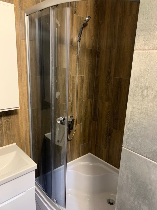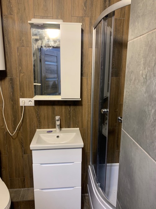 - Зручний розкладний диван з нішею для зберігання— Просторий санвузол із душовою кабіною
