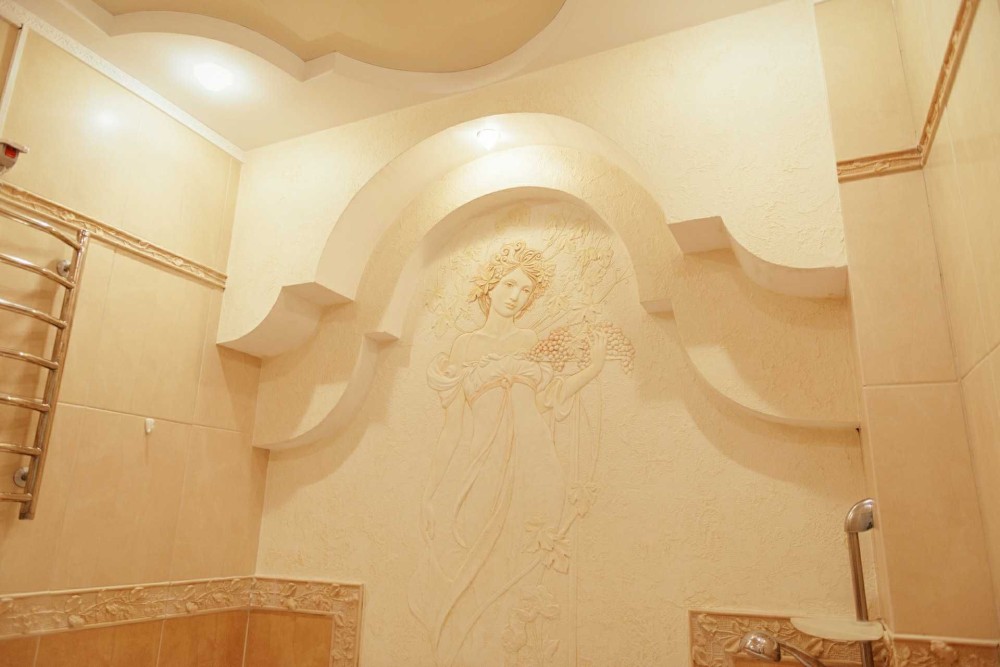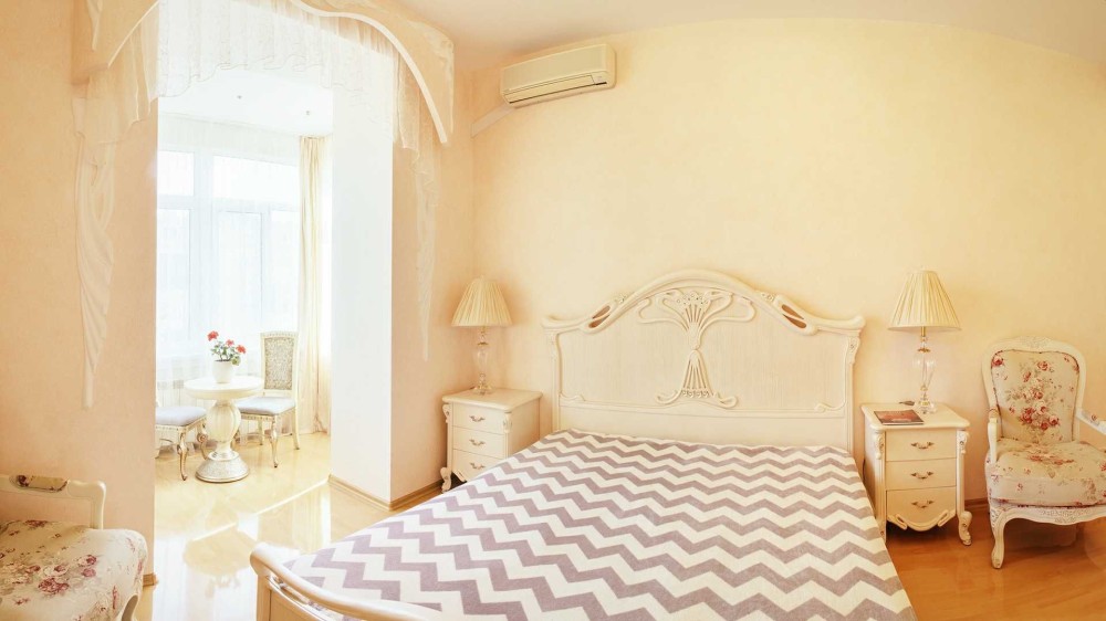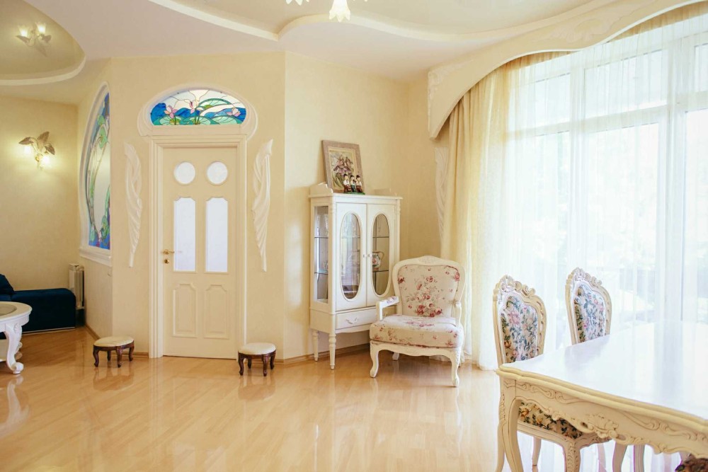 Оформлена у вишуканому стилі з ліпниною і вітражем, працює мармуровий камін на дровах, джакузі, кондиціонери, посудомийна машина. Просторий і довгий балкон. Усі вікна виходять на зелений і тихий внутрішній дворик.