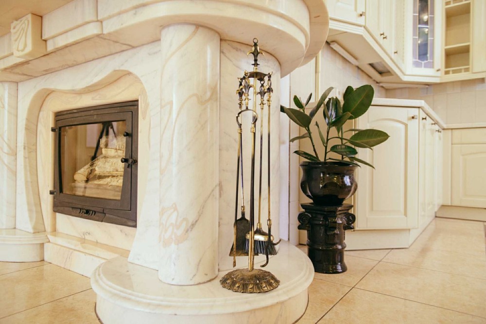 Вітальня: обідній стіл, диван, журнальний столик, кондиціонер, мармуровий камін.