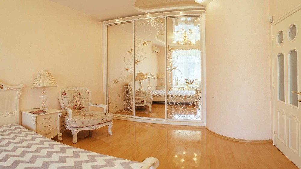 Спальня: двохмісне ліжко, кондиціонер, тумбочки, комод, шафа-купе з великими дзеркалами, телевізор, столик для відпочинку.