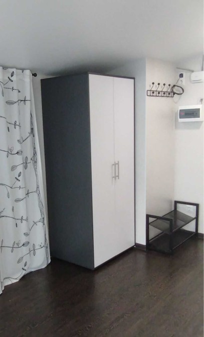 В кімнаті: двоспальне ліжко, комод для речей, шафа-купе, полиця та тумба для зберігання взуття, сушарка для одягу.