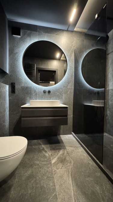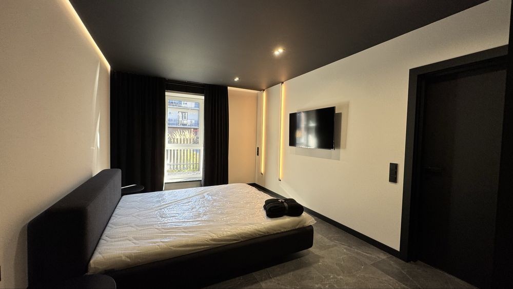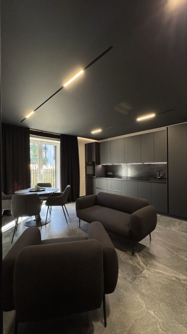 Квартира розташована на першому поверсі з великою терасою. Інтер’єр виконаний у сучасному стилі luxury modern, з дорогими меблями та якісною технікою.