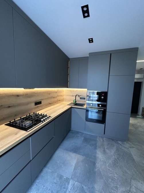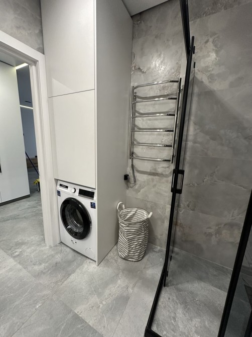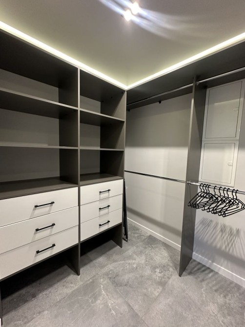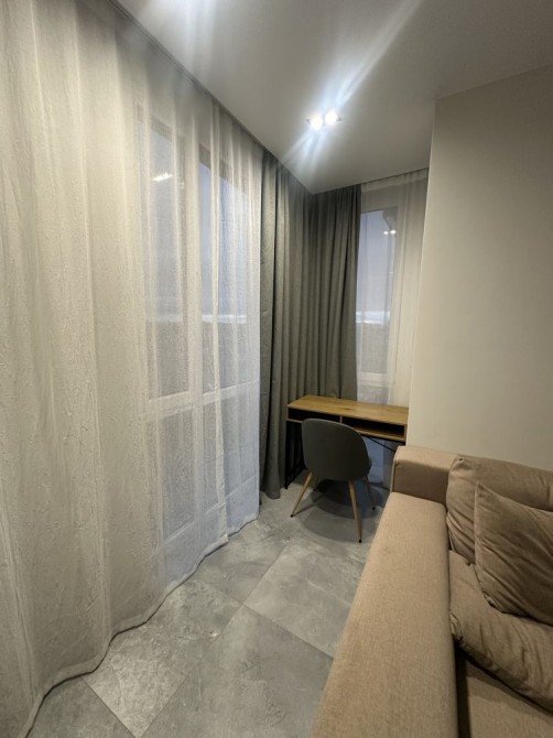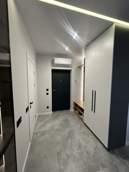 Житло обладнане технікою та меблями, з окремою гардеробною кімнатою та панорамними вікнами.