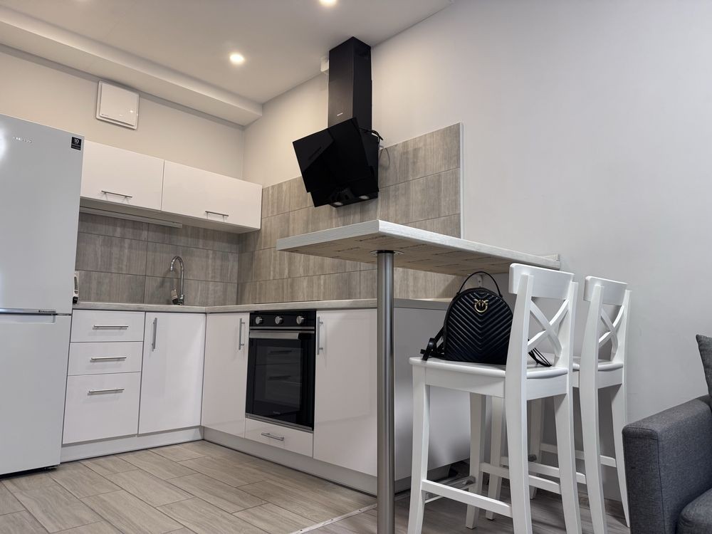 Простора кухня-студія з вбудованою технікою, духовою шафою, варильною поверхнею, холодильником,
