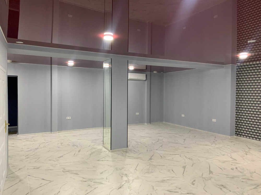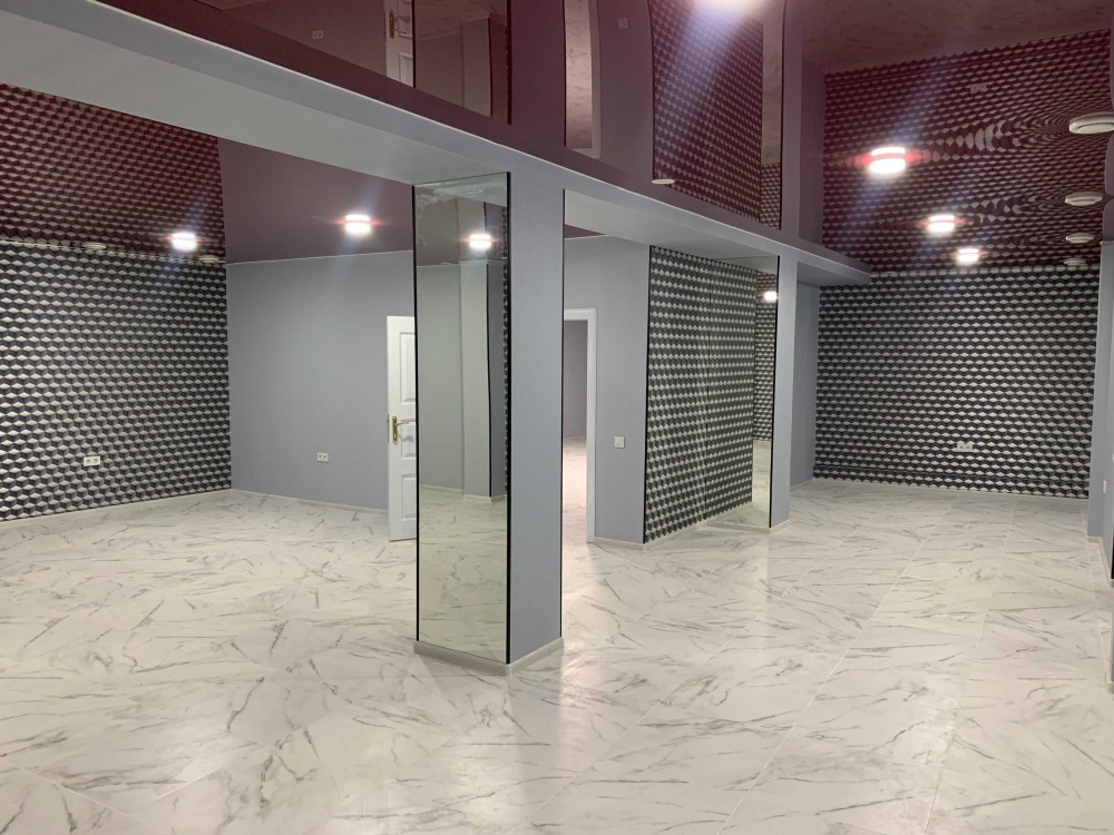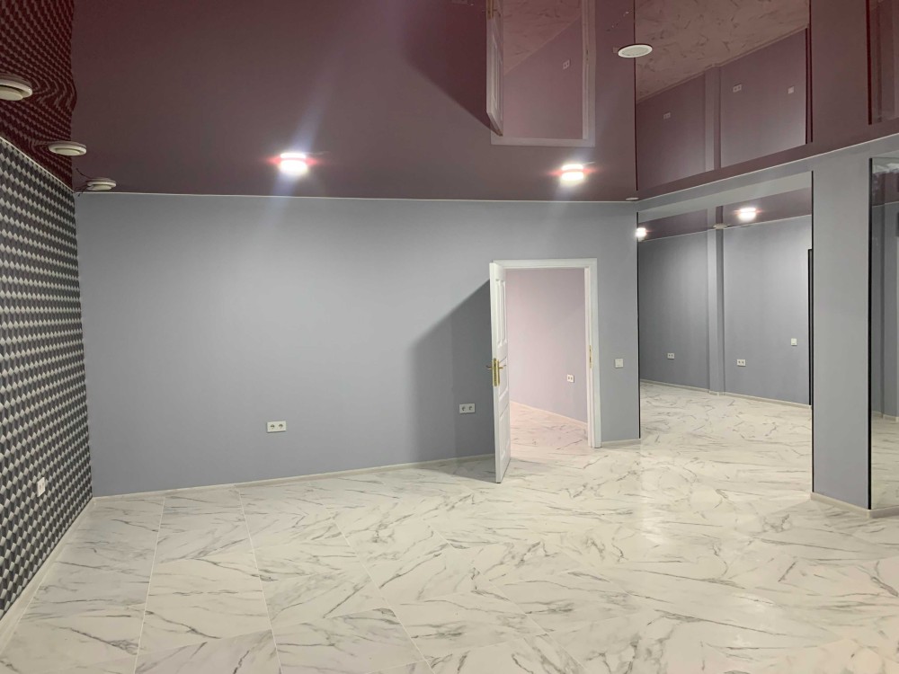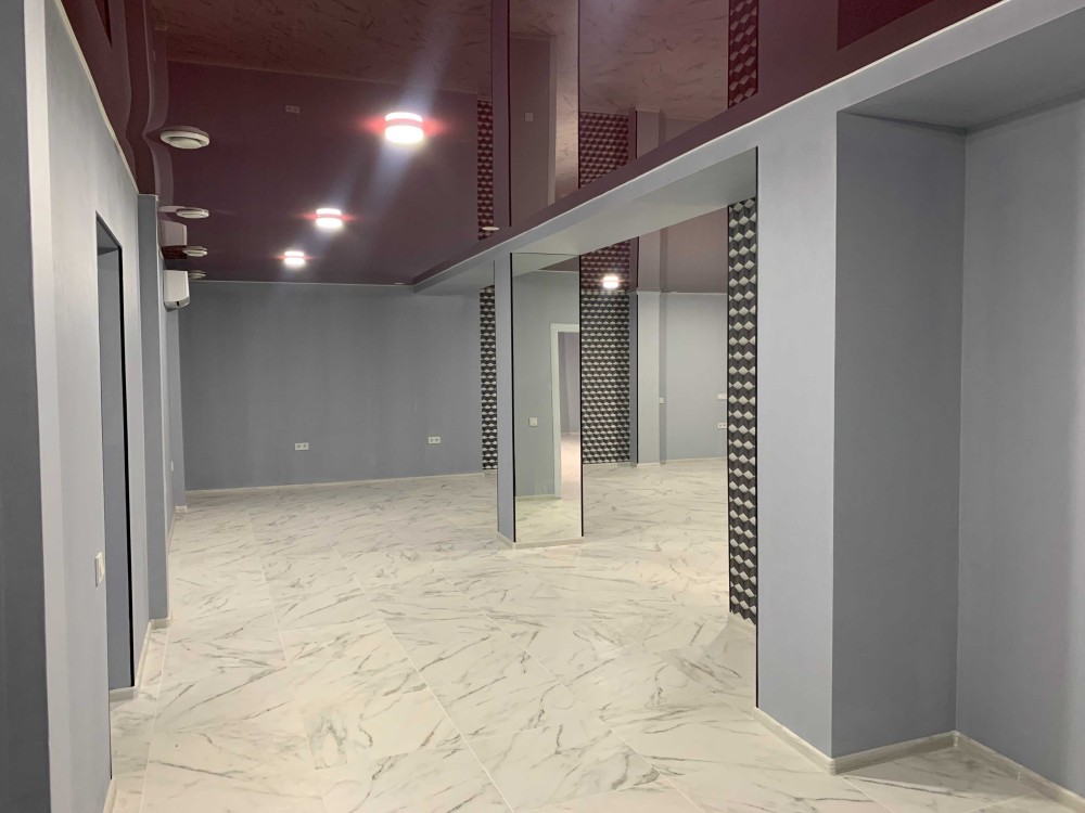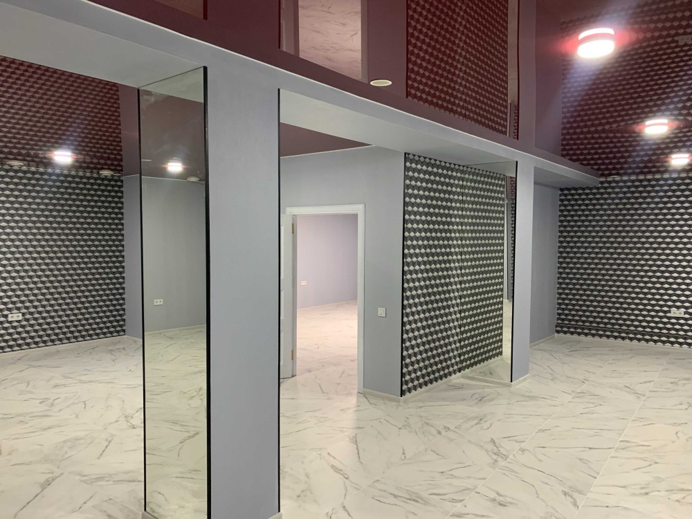 Висота стелі 2,70 м. Стіни покриті шпалерами, на стовпах дзеркала. Натяжна стеля.