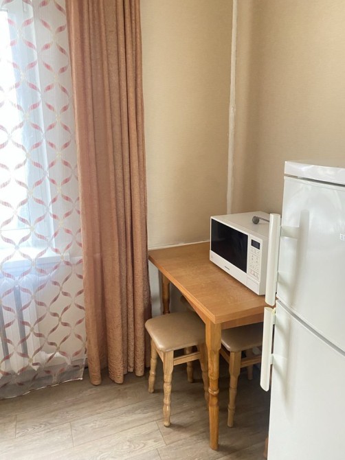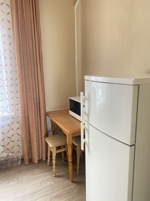В кухні е всі меблі, холодильник та мікрохвиловка.