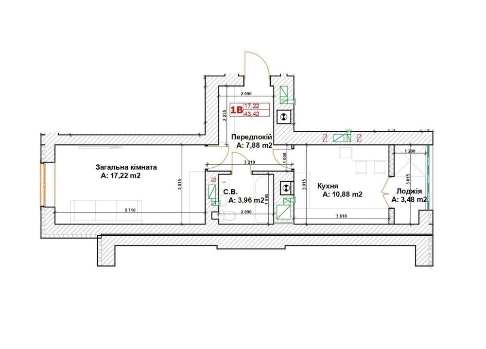 Площа 44 м², Кухня-вітальня 15 м², є місце де поставити диван