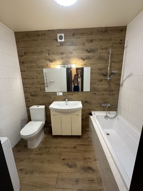Ванна кімната суміжна та є пральна машина.