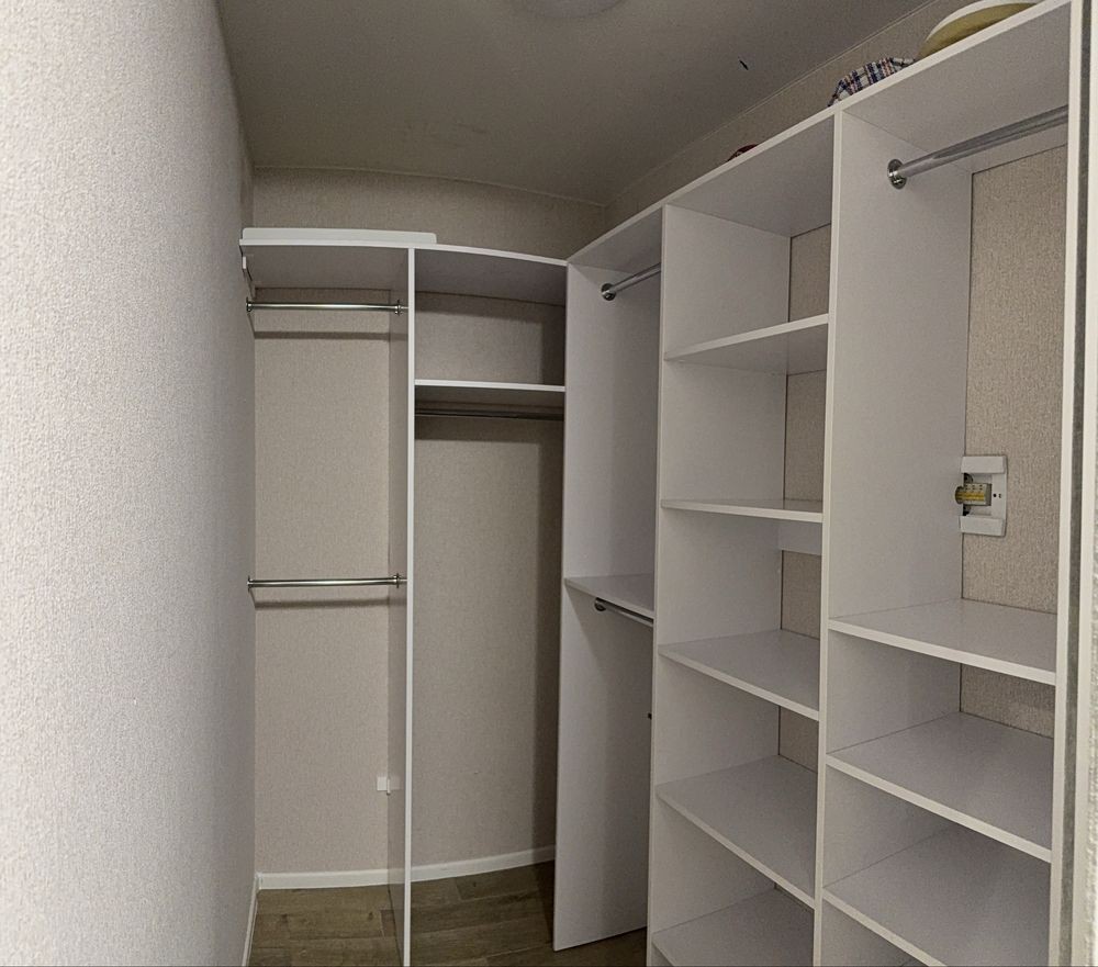 Продумане планування: окрема спальня з ліжком та шафою, кухня з диваном, повноцінна гардеробна - без відчуття тісноти.