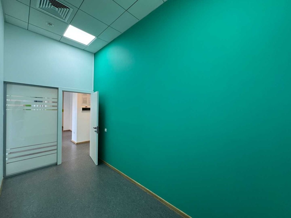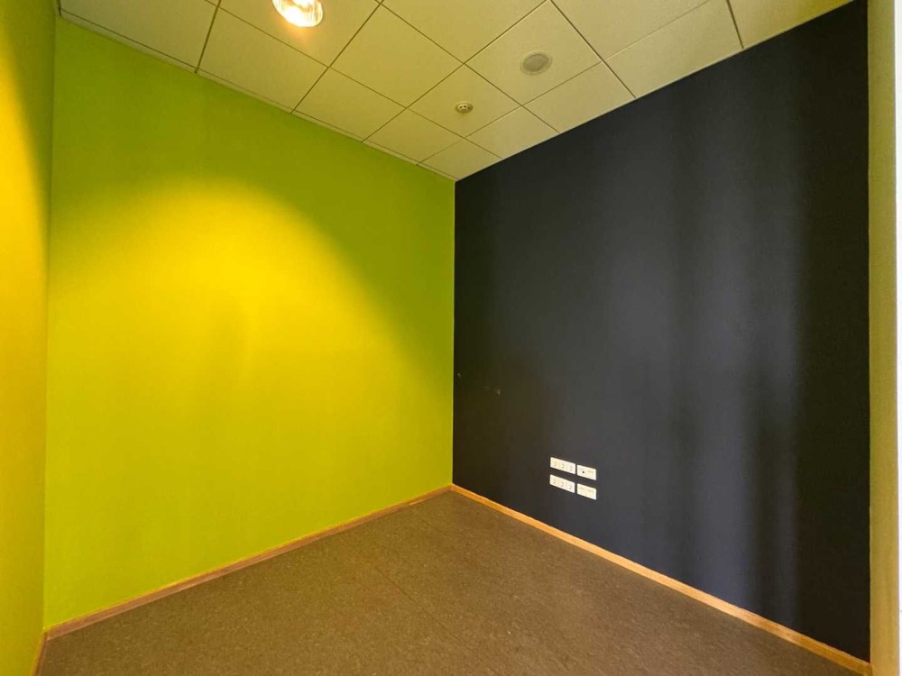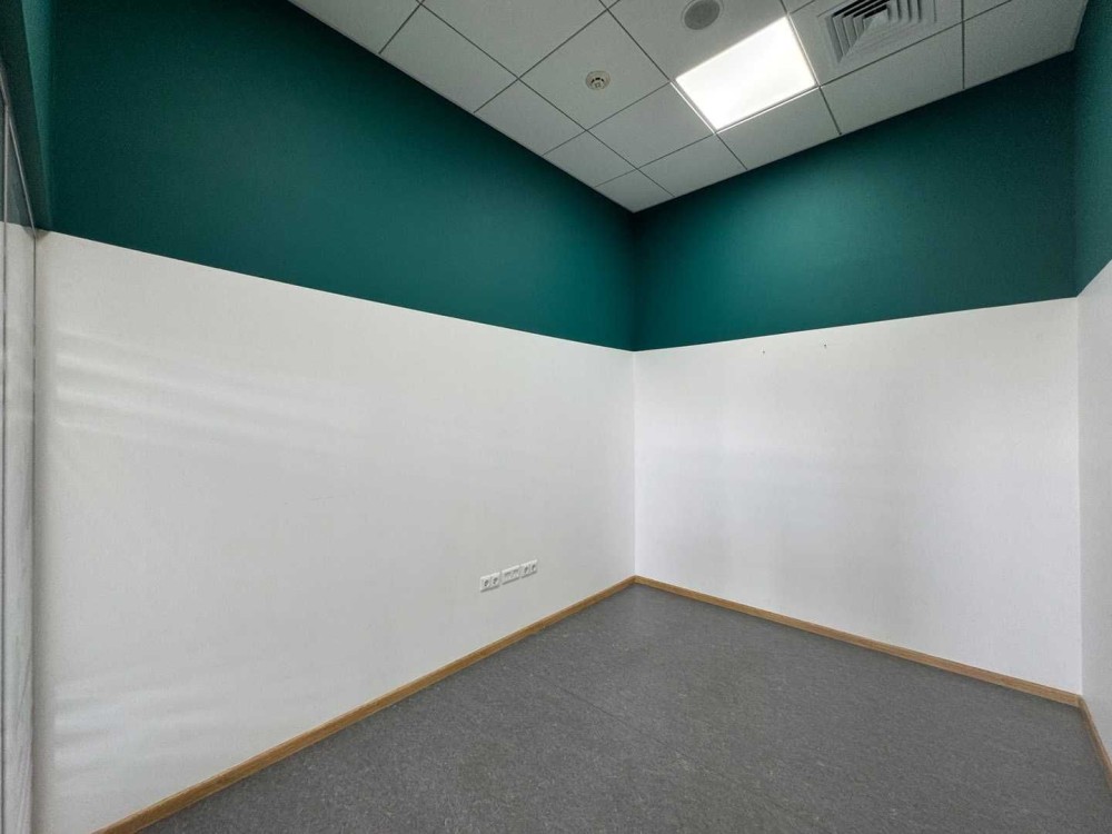 Білофарбовані стіни, ковролін на підлозі, підвісна стеля Armstrong