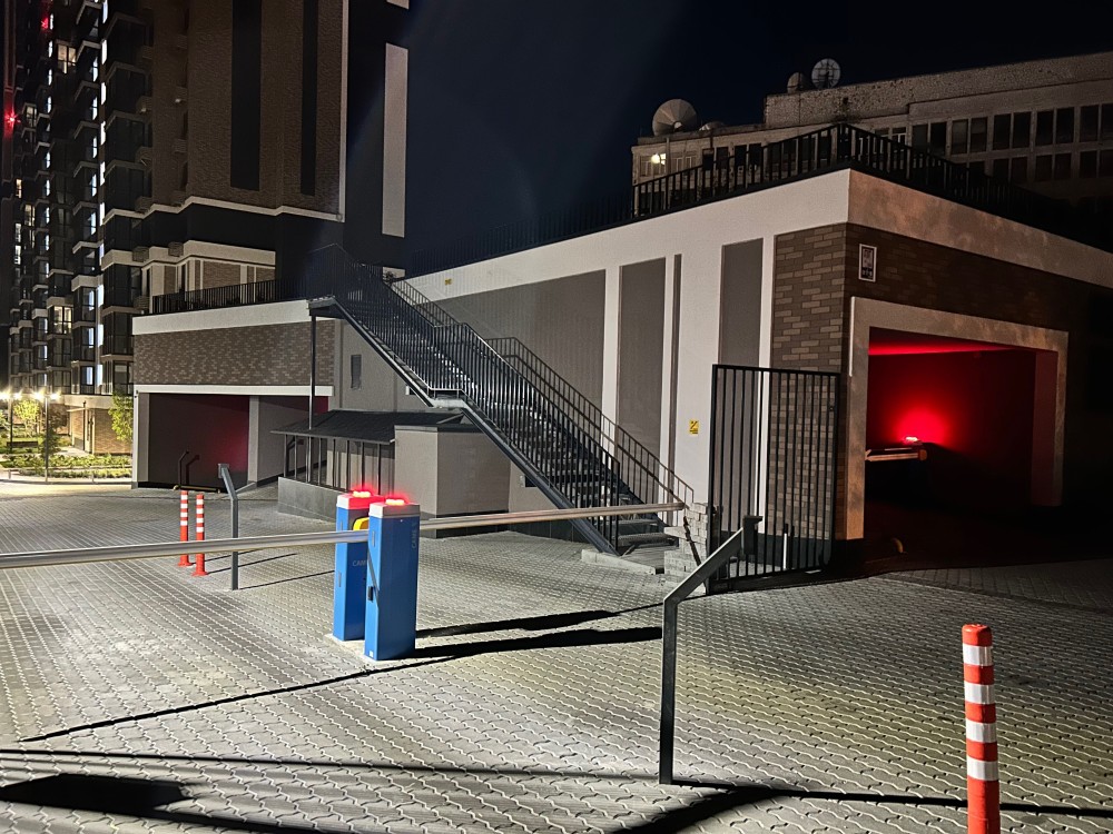 Огороджена парковка з цілодобовою охороною і шлагбаумом, що відкривається персональним пультом.