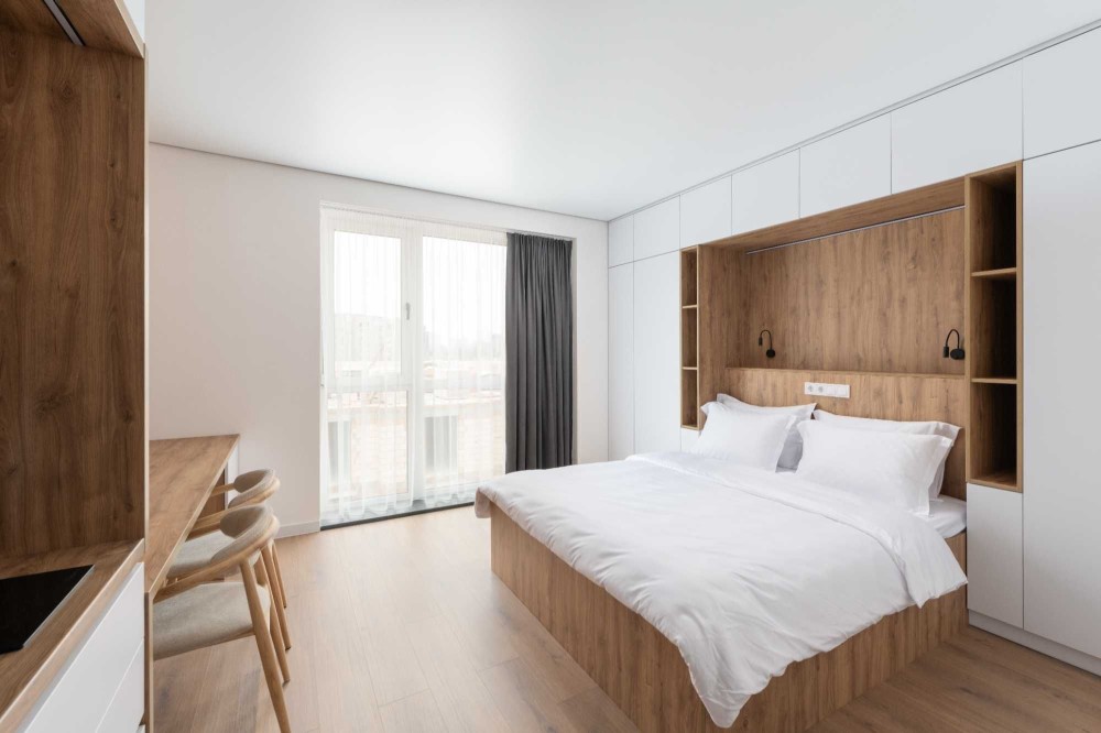 Номери мають сучасний ремонт у світлих тонах з меблями у білому та світло-коричневому кольорах в інтер'єрі.