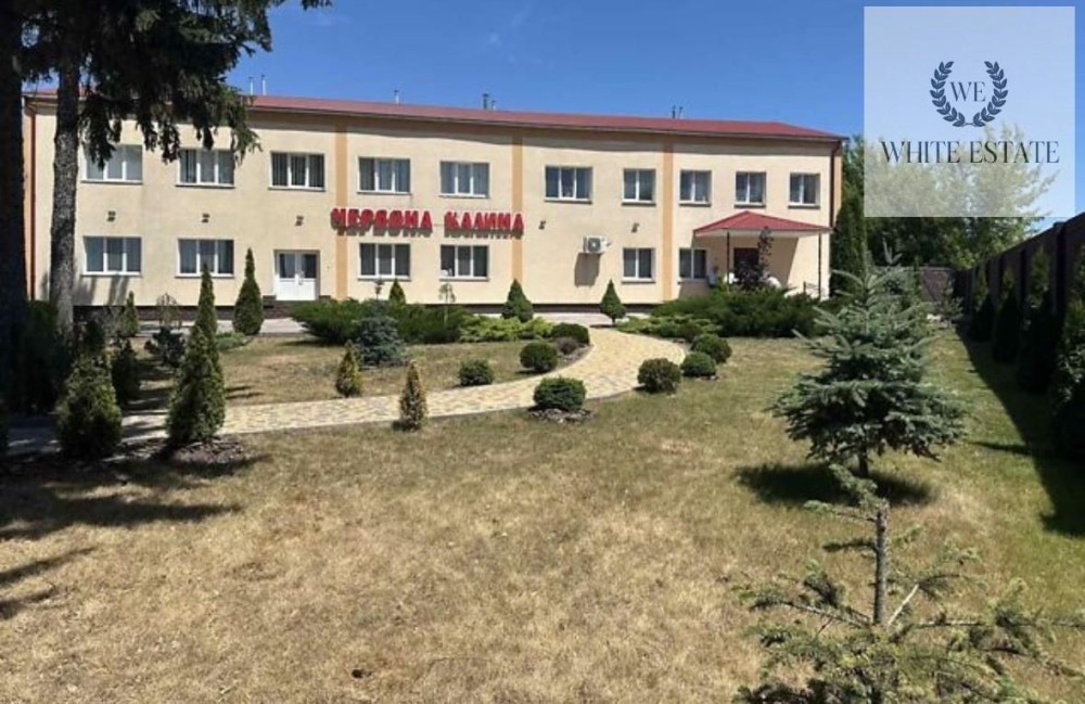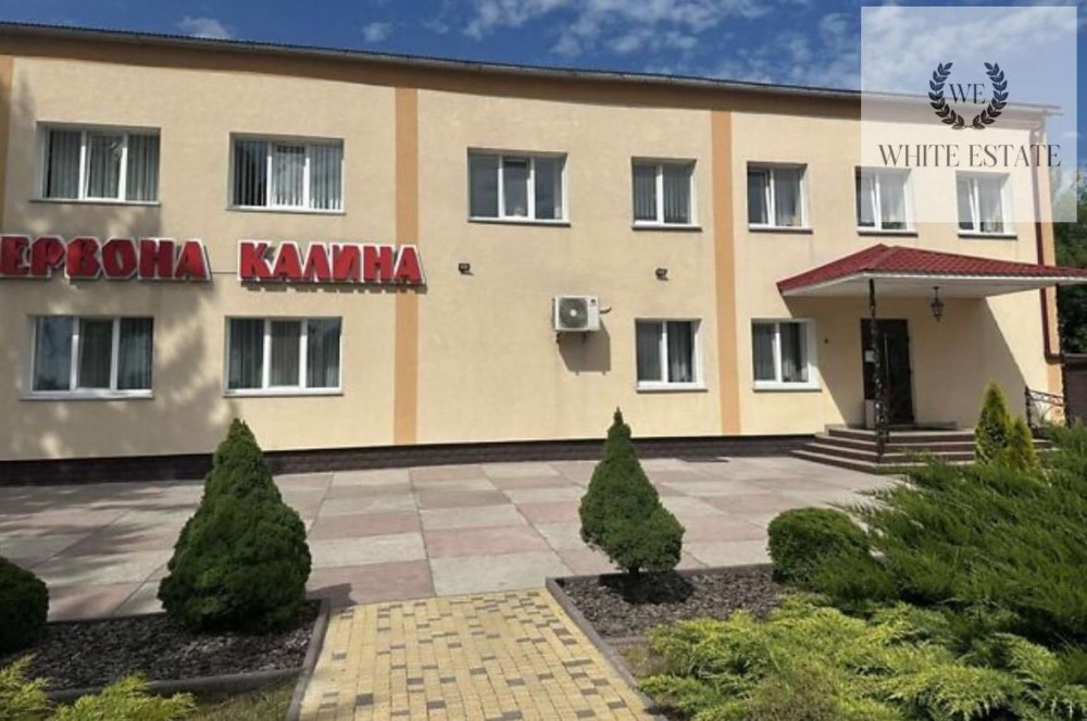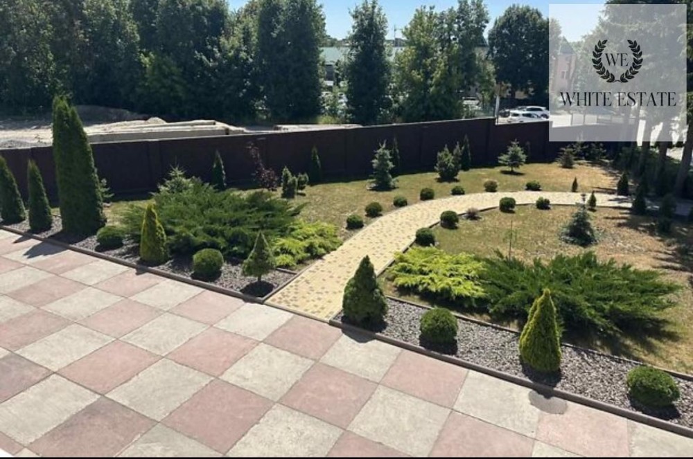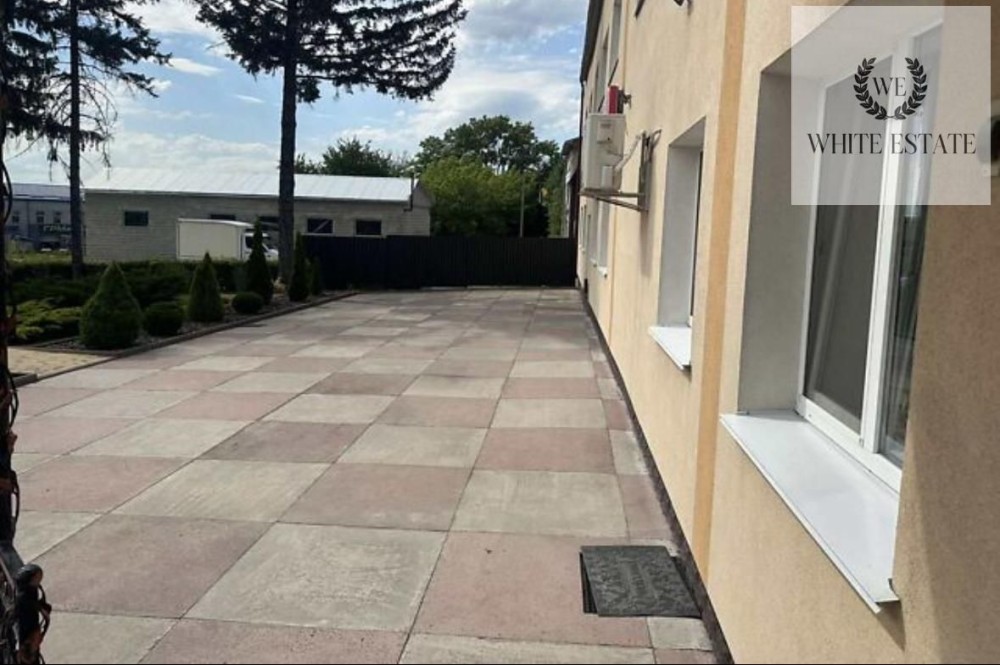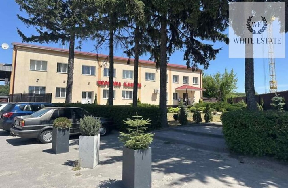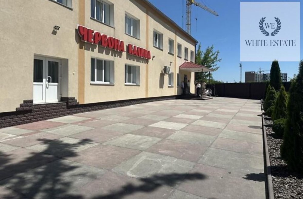 Територія біля будівлі облаштована декоративними доріжками, зеленою зоною та обгороджена високим парканом, що створює комфортну ізольовану атмосферу для бізнесу