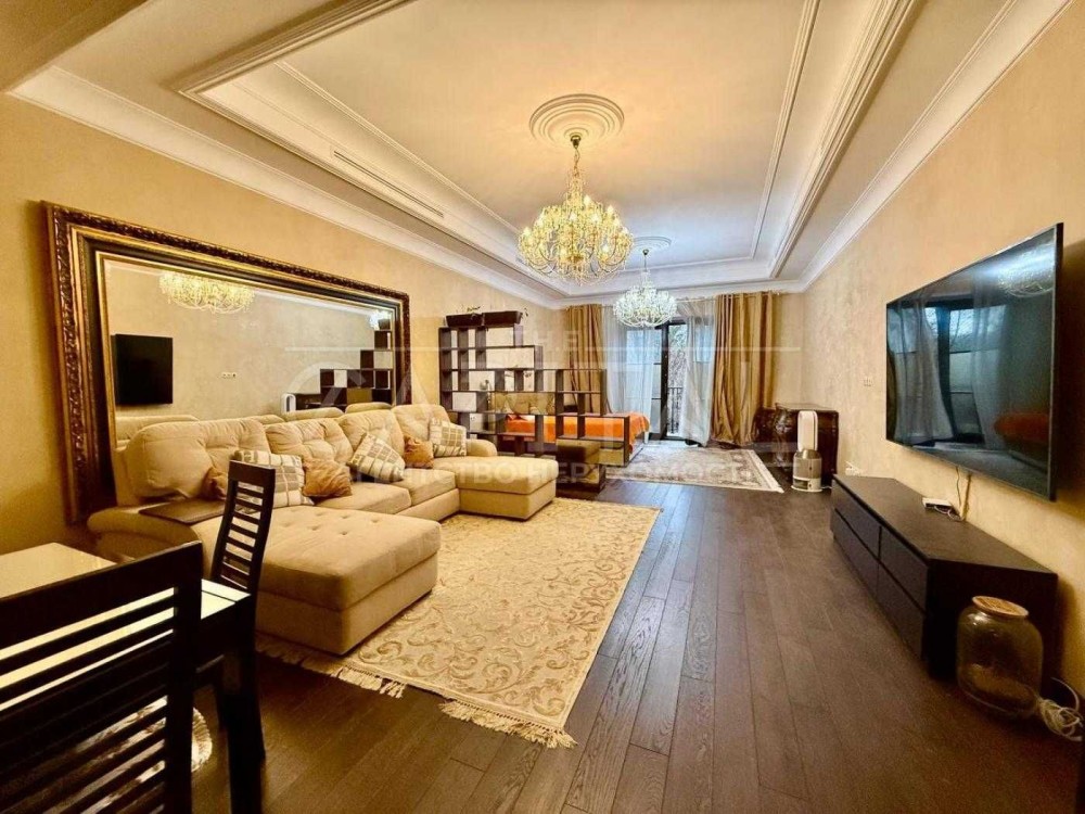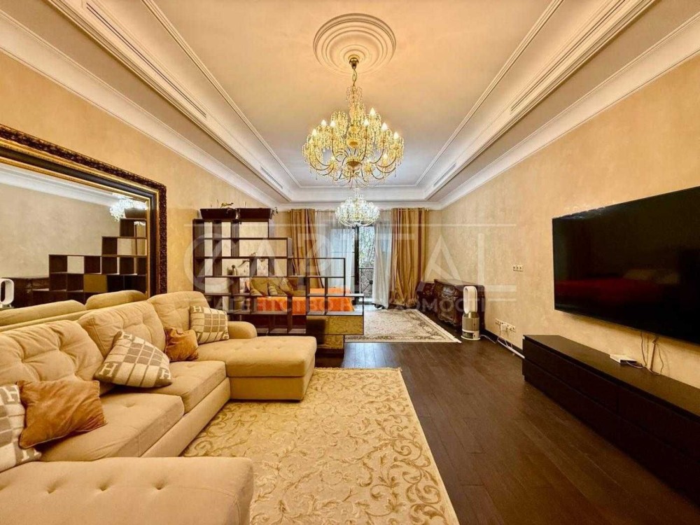 Квартира виконана у сучасній класичній стилістиці з використанням преміальних матеріалів. Висота стель — 4 м, що створює відчуття простору та світла.