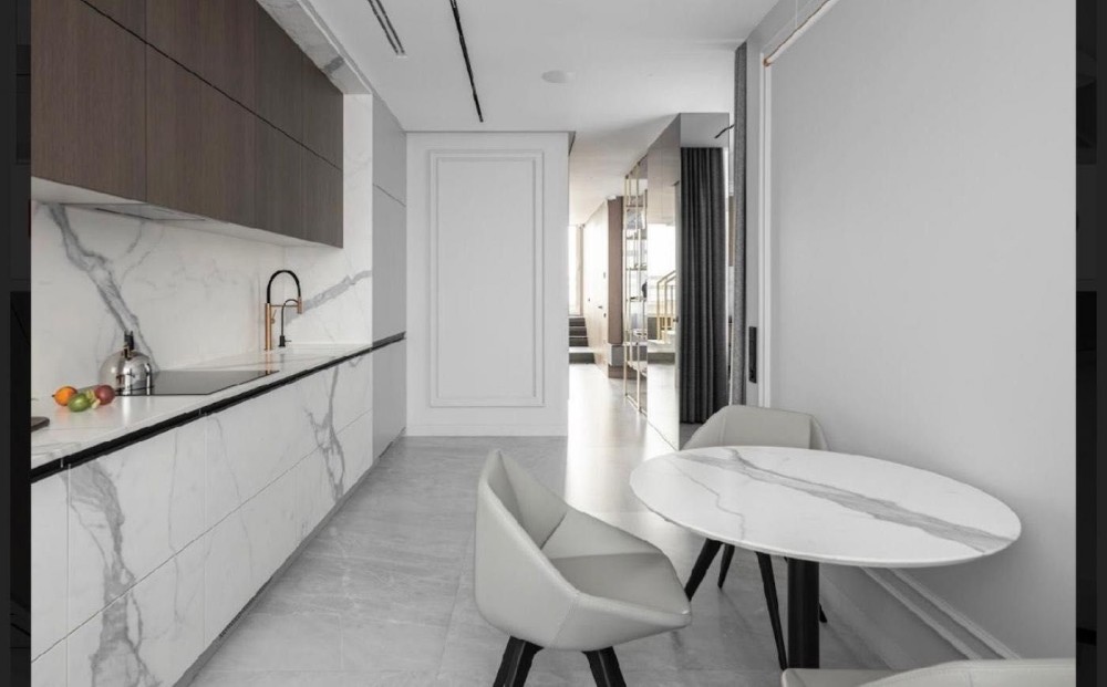 - Кухня зроблена по індивідуальному проєкту, використаний широкоформатний керамограніт, навіть на фасадах в поєднанні зі шпоном з натурального дубового дерева;