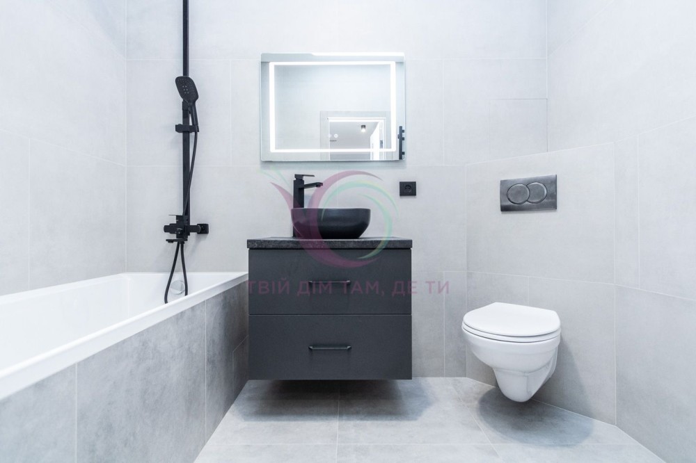 Змонтовано натяжну стелю з тіньовим профілем, всюди де плитка пілігрів підлоги, встановлено кондиціонер, техніка фірми Hansa, холодильник та морозильна камера прихованого монтажу, стильний рукомийник.