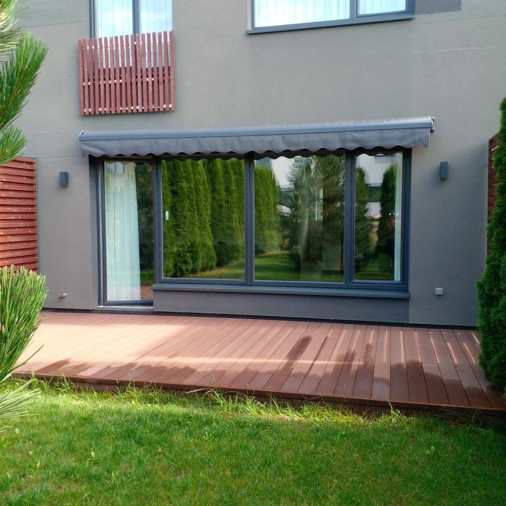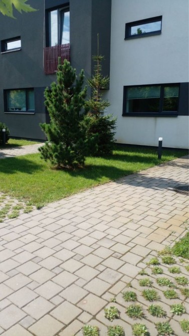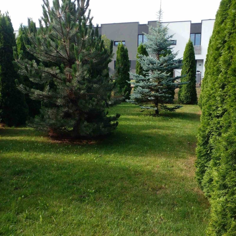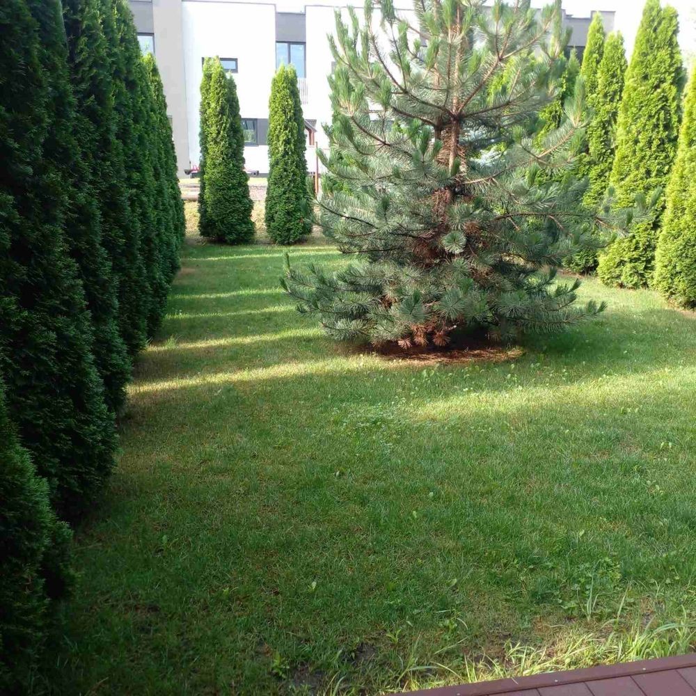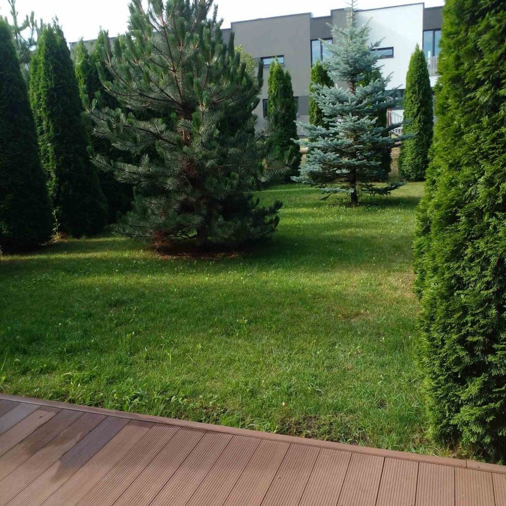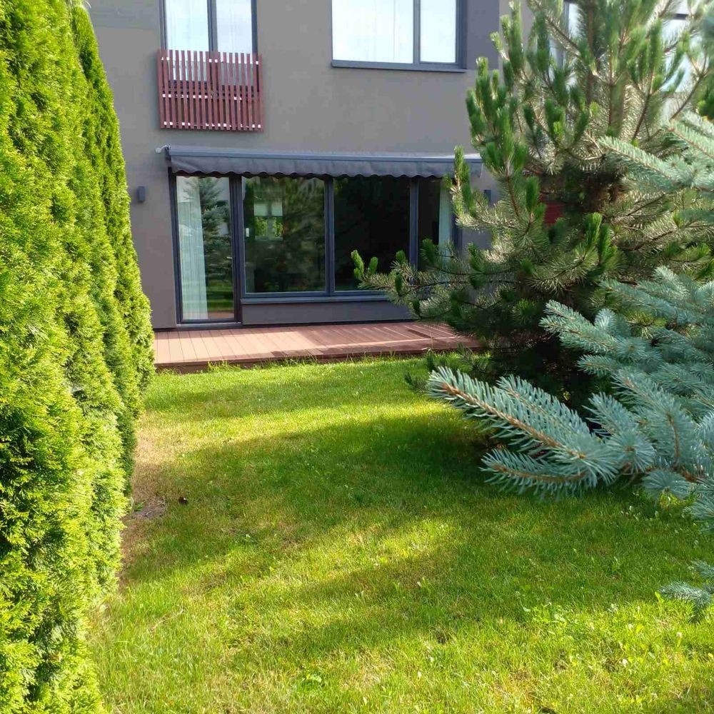 На ділянці розміщений рулонний газон, є літні меблі, дитячий майданчик.