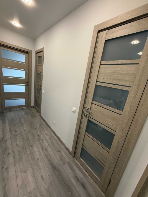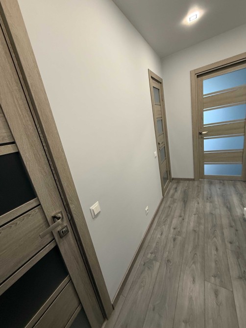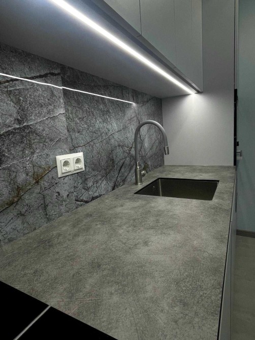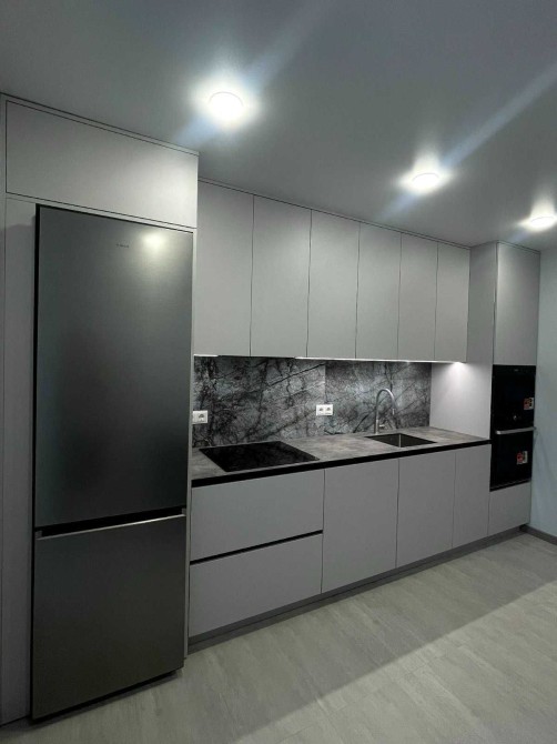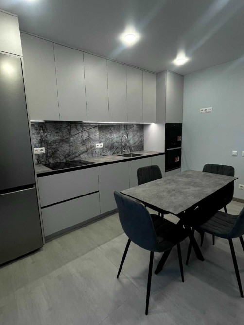 Нові меблі: розкладний великий диван в залі, вбудовані меблі по дизайн - проекту на кухні, обідній стіл, стільці, велика шафа по дизайн-проекту з підсвіткою у вхідному блоці.