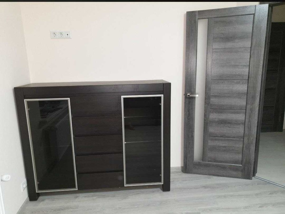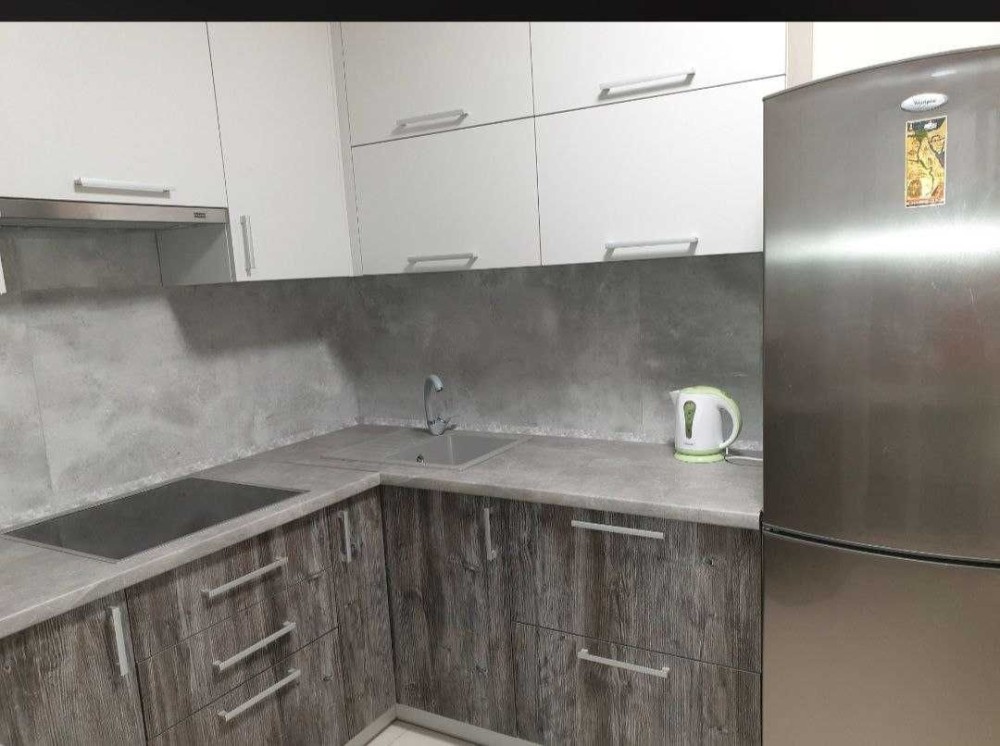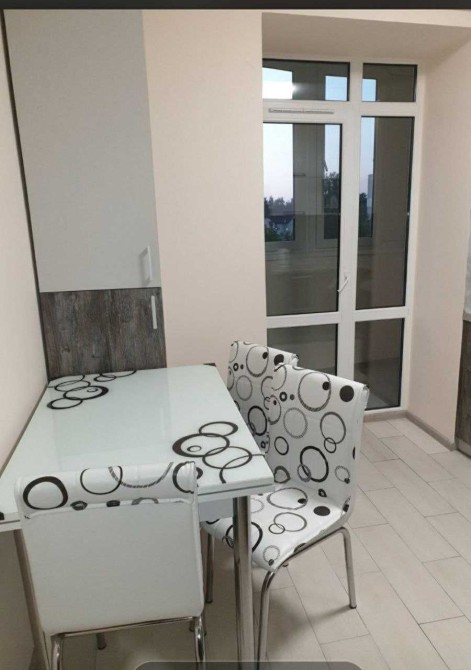 Простора кімната з розкладним диваном та місткою шафою, світлі стіни й лаконічний інтер’єр. Кухня повністю укомплектована: є холодильник, варильна поверхня, витяжка, мікрохвильова піч, достатньо місця для зберігання та приготування їжі.