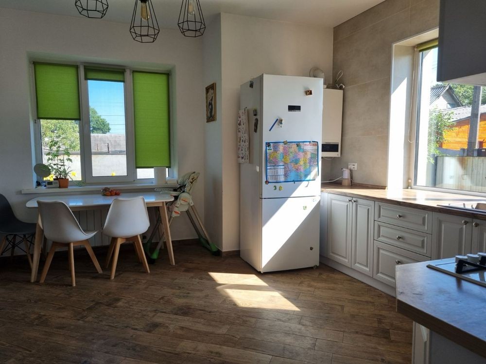 Планування будинку: 4 кімнати, 2 санвузли, комірчина. на першому поверсі - тамбур, простора кухня, (холодильник, посудомийна машин лита, духова шафа) окрема кладова, світла вітальня з виходом на задній двір, гостьова спальня або ж кабінет. Також є санвузол з душем.