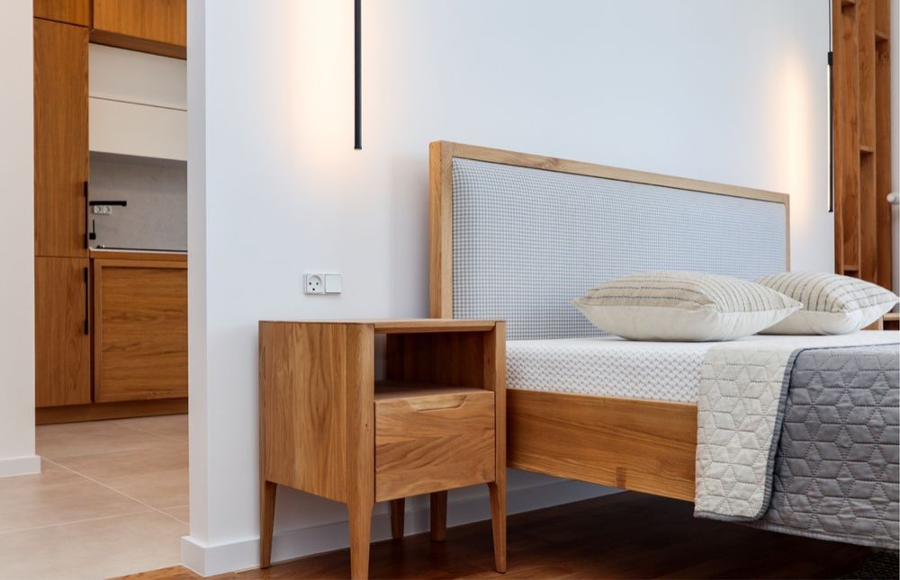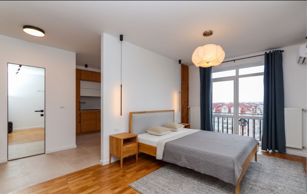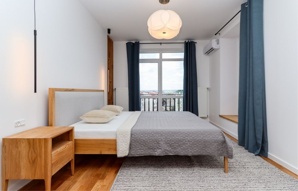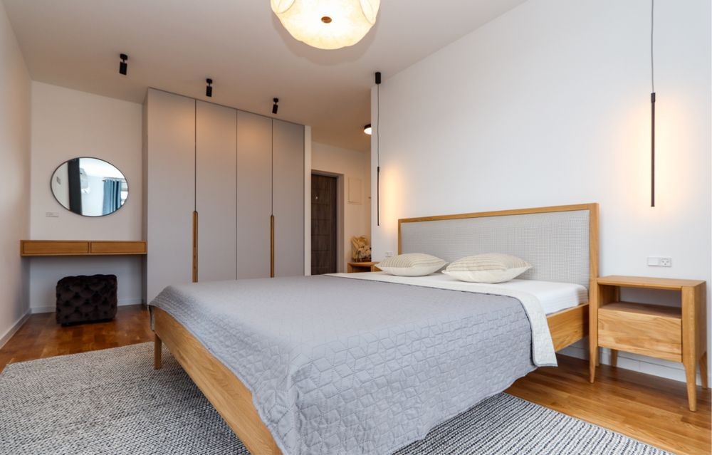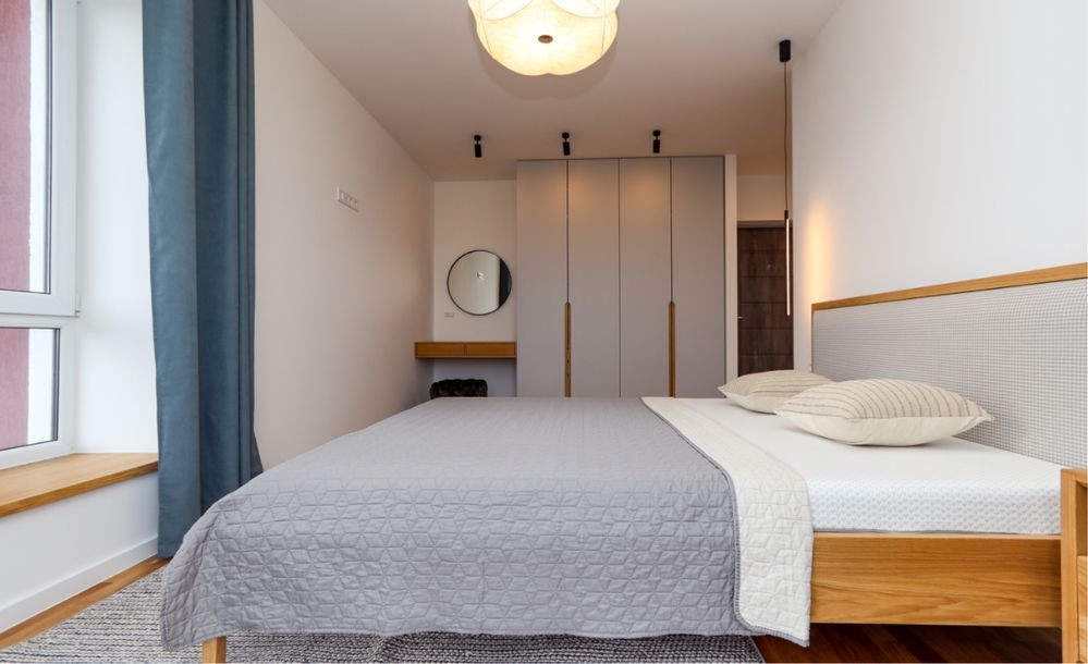 Затишна спальня з великим двоспальним ліжком, гарною сірою ковдрою та світлими подушками. Є простора шафа для зберігання речей, туалетний столик з дзеркалом, сучасні світильники. Атмосферу доповнюють великі вікна з виходом на підвіконня-полицю та стильні штори.