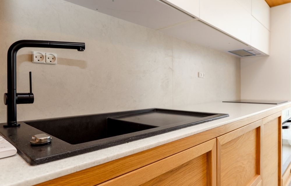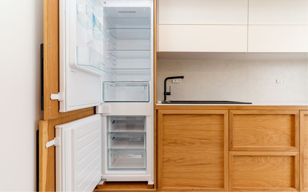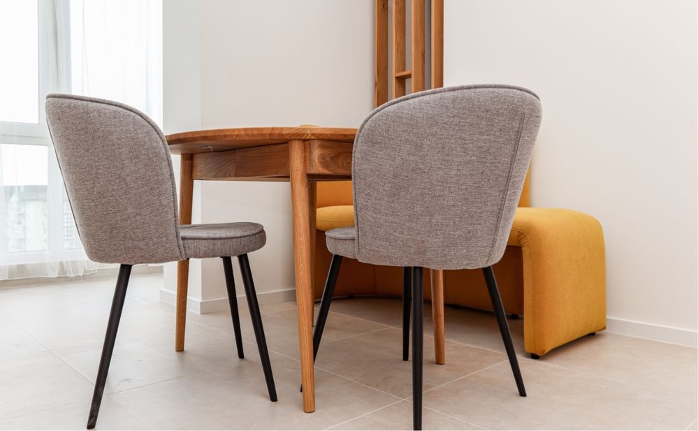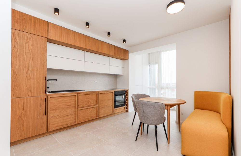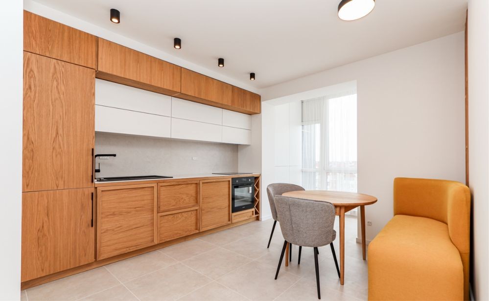 Велика та простора кухня з дерев’яними фасадами та білими верхніми шафами виглядає дуже затишно та сучасно. Встановлено вбудовану техніку, є духовка, варильна поверхня, мийка з чорним змішувачем. Для зручності облаштовано обідню зону: круглий стіл, м’які стільці та яскравий гірчично-жовтий диванчик, який додає інтер’єру акценту. Завдяки панорамним вікнам простір наповнений світлом.