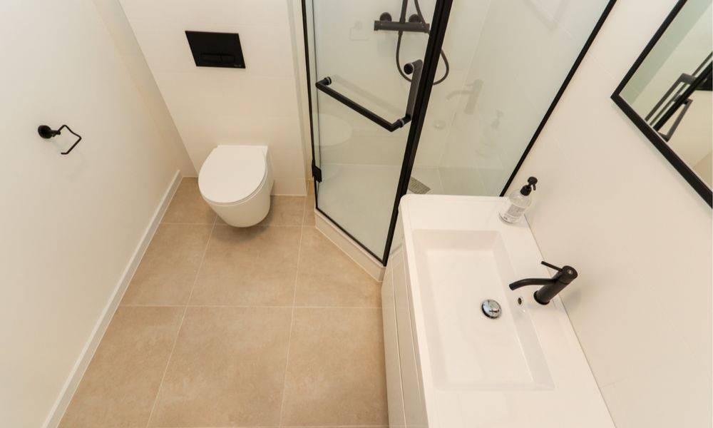 Сучасний, виконаний у мінімалістичному стилі. Є душова кабіна зі скляними перегородками та чорними акцентами, підвісний унітаз та стильна тумба з умивальником. Вся сантехніка якісна, з чорними змішувачами.