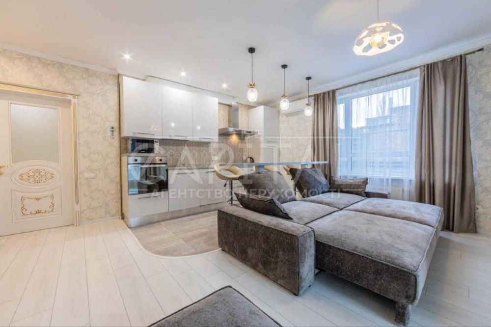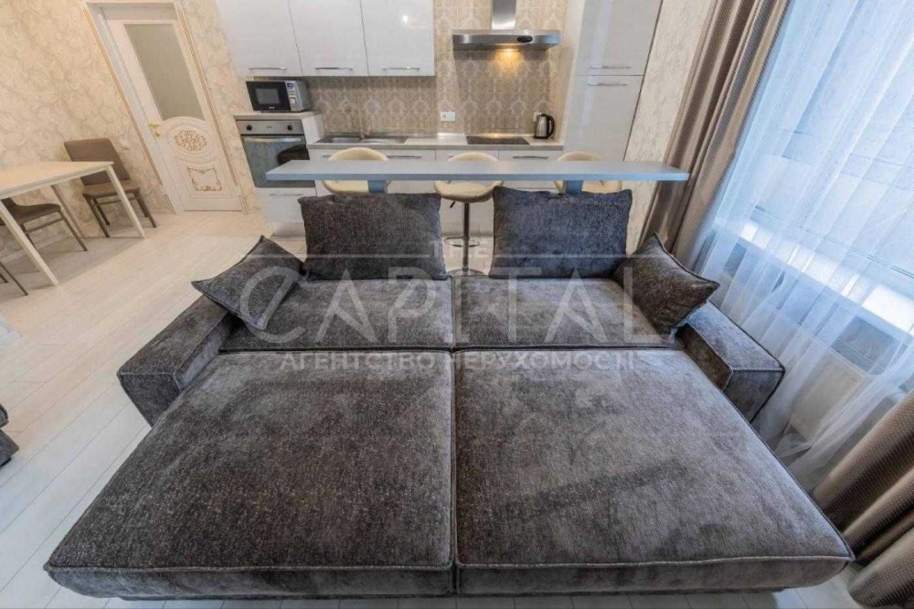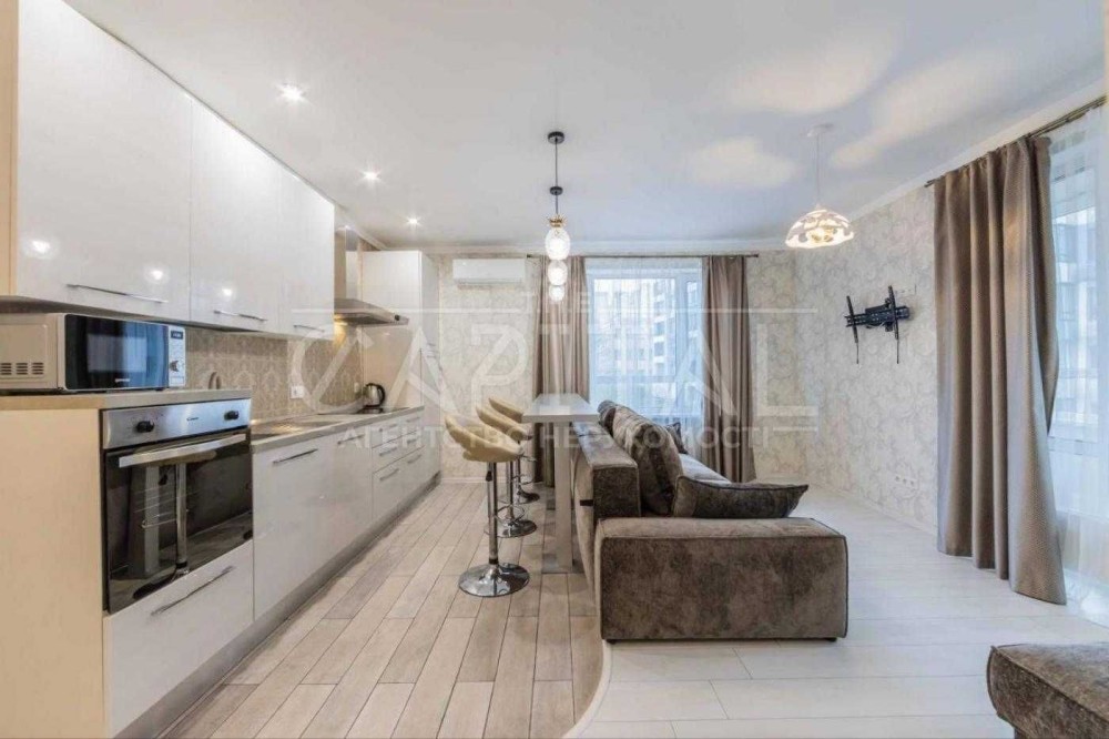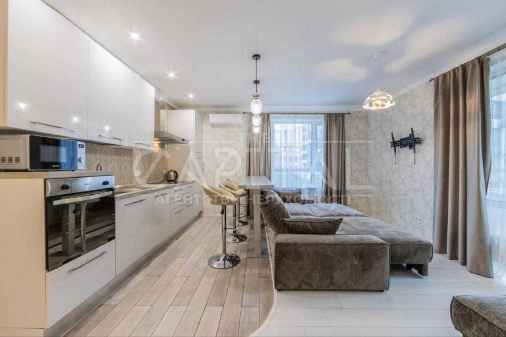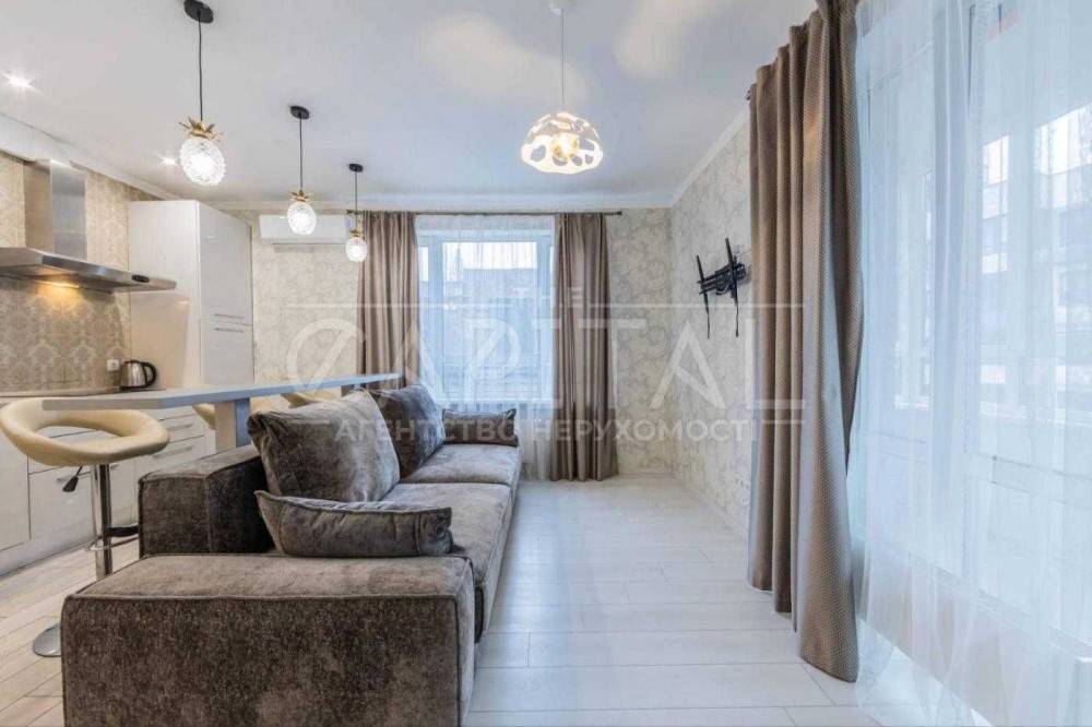 • Простора кухня-студія (25 м²) з барною стійкою, шкіряними стільцями, новим диваном-ліжком, вихід на засклений балкон.